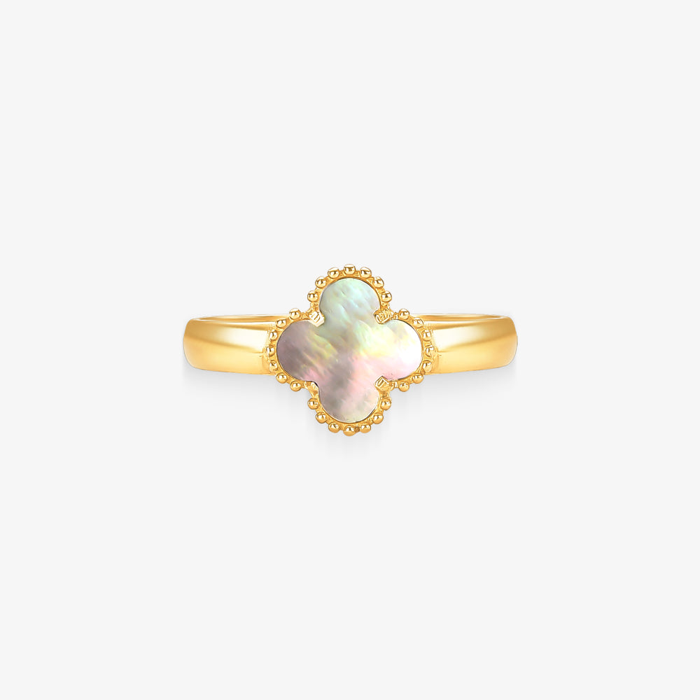Anel Trevo Madre Pérola Cinza em Ouro Amarelo 18K